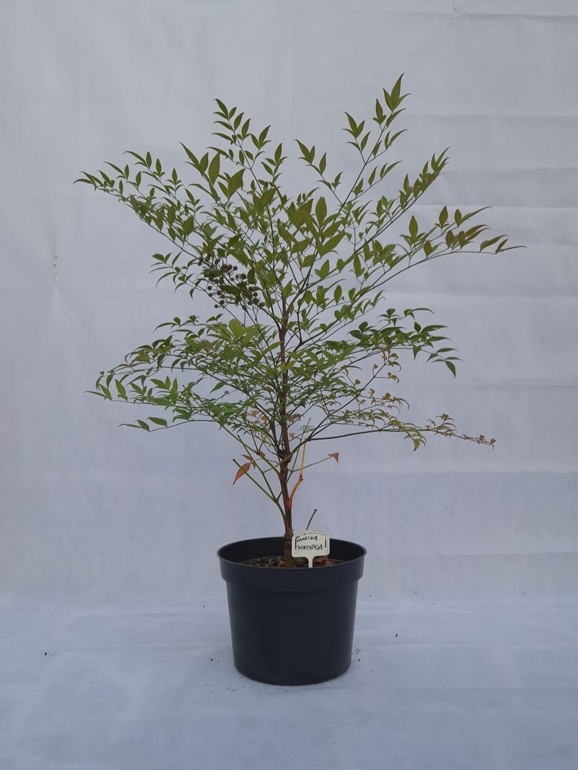 Nandina domestica, poznata i kao nebeski bambus, je atraktivan zimzeleni grm koji se ističe po svojim perastim listovima i promjenjivim bojama kroz godišnja doba. U proljeće mladi listovi izbijaju u brončano-crvenim nijansama, ljeti prelaze u sjajnu zelenu boju, dok u jesen postaju vatreno crveni. Grm također razvija bijele cvjetove u grozdovima, koji se kasnije pretvaraju u jarko crvene bobice, dodajući dodatni ukrasni element zimi. Raste do visine od 1,5-2 metra, te je idealna za sadnju u grupama ili kao soliterni grm. Nandina domestica voli sunčana do polusjenovita mjesta i prilagodljiva je raznim tipovima tla.